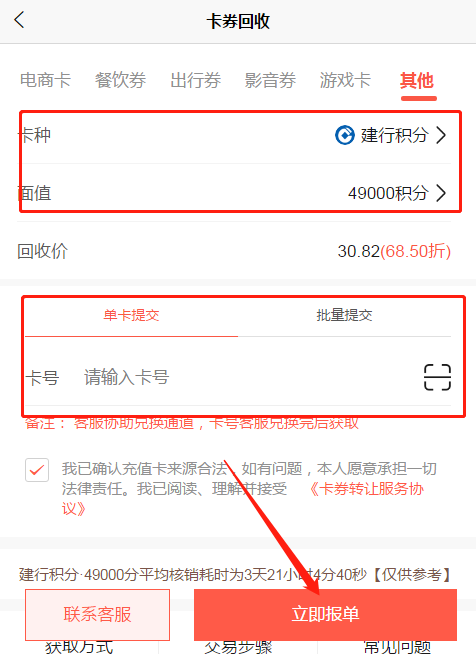 选择对应的卡种(建行积分),面值,接下来填写对应信息,点击立即报单就可以啦。