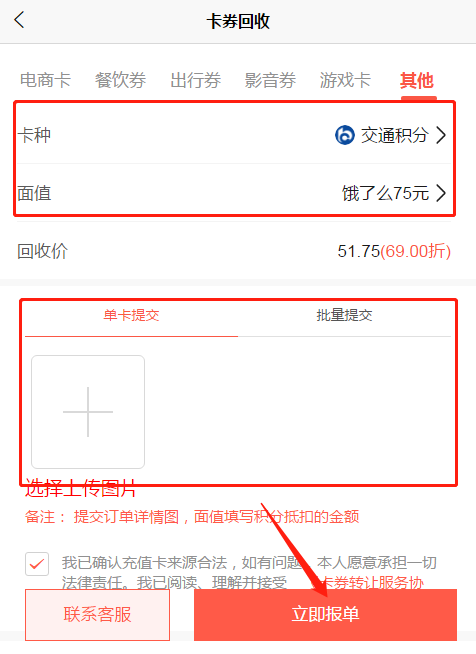 选择对应的卡种(交通积分),面值,接下来填写对应信息,点击立即报单就可以啦。
