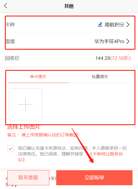 选择对应的卡种(南航积分),面值,接下来填写对应信息,点击立即报单就可以啦。