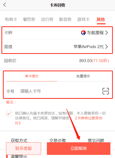 选择对应的卡种(东航里程),面值,接下来填写对应信息,点击立即报单就可以啦。