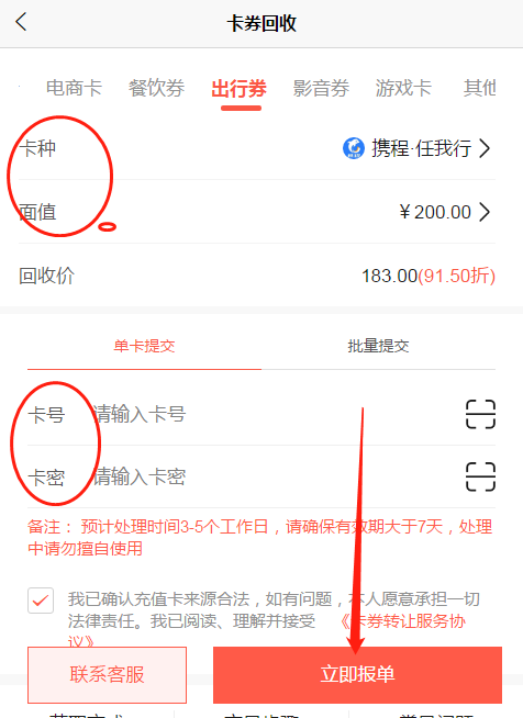 选择对应的卡种(携程·任我行),面值,接下来填写对应信息,点击立即报单就可以啦。