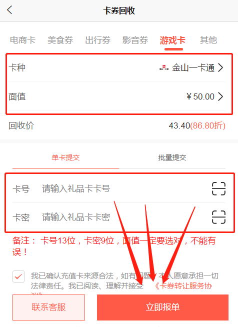 选择对应的卡种(金山一卡通),面值,接下来填写对应信息,点击立即报单就可以啦